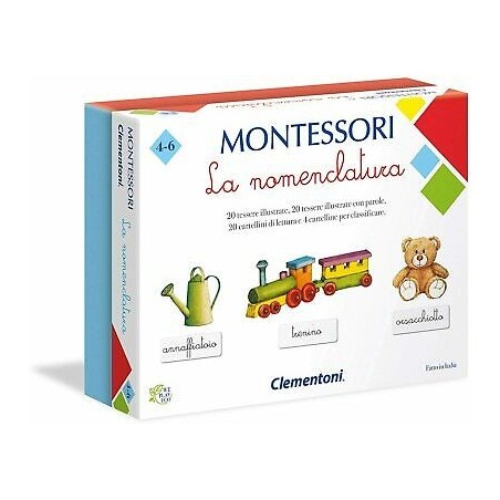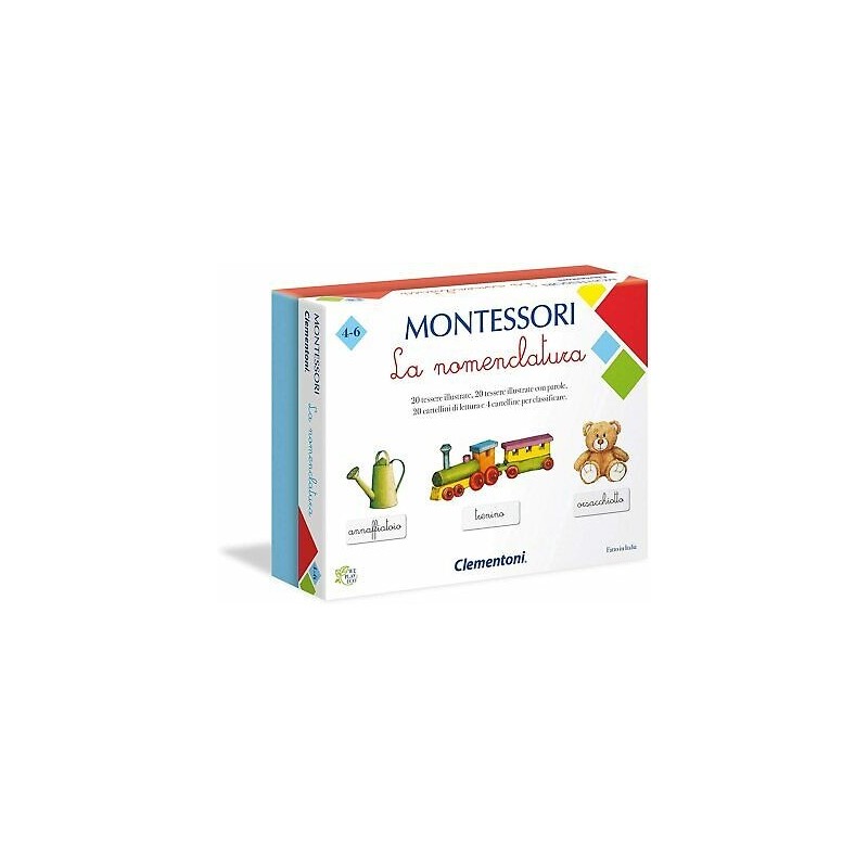 I giochi Montessori di Clementoni propongono alcune attività ispirate al metodo educativo sviluppato da Maria Montessori, scienziata italiana nota in tutto il mondo per il suo contributo in campo pedagogico. La Nomenclatura - Montessori è un gioco ispirato al metodo montessoriano che invita iI bambino ad abbinare le tessere con le immagini a quelle con le parole corrispondenti. L’obiettivo è di stimolare lo sviluppo del lessico in modo naturale e senza forzature.