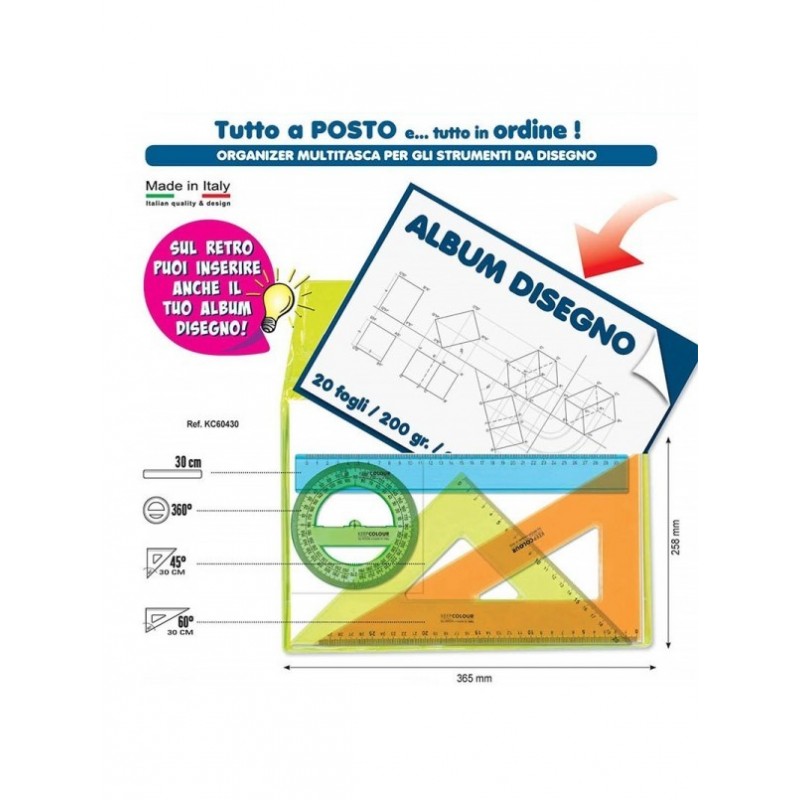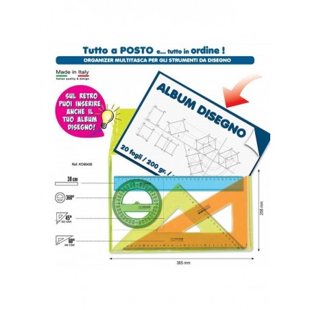 Cartellina disponibile in 3 colori fluo: giallo, arancio o verde, chiusura doppia a strappo e multitasche per contenere in ordine tutti gli strumenti utili al disegno tecnico.