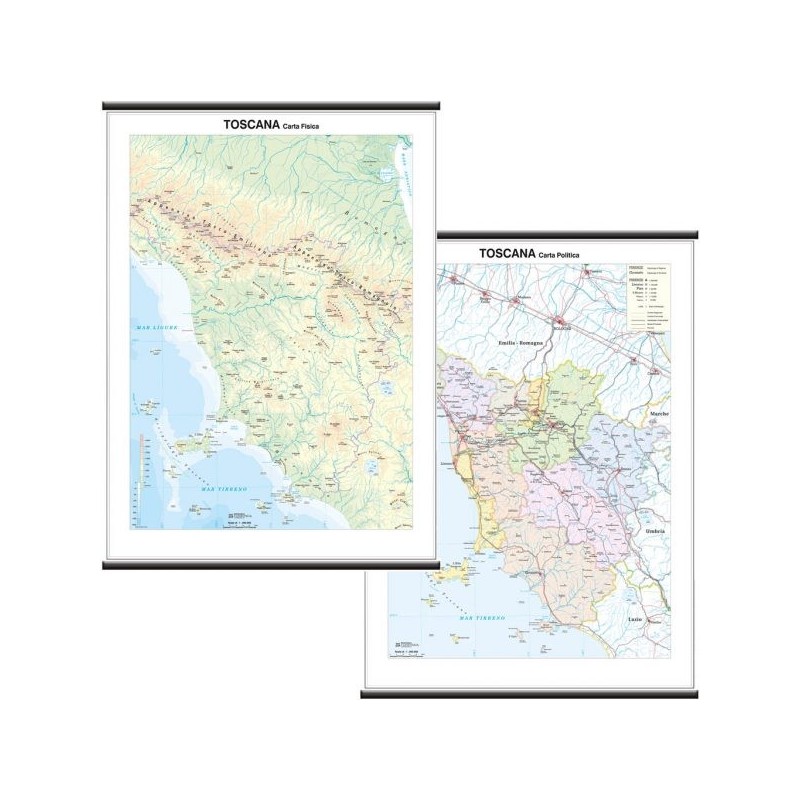 Carta geografica per uso didattico, realizzata con doppia cartografia (fisica e politica), stampa su carta plastificata opaca; completa di aste in materiale plastico con ganci per affissione a parete.