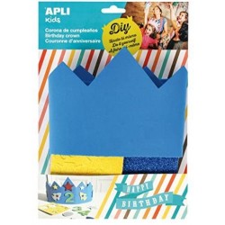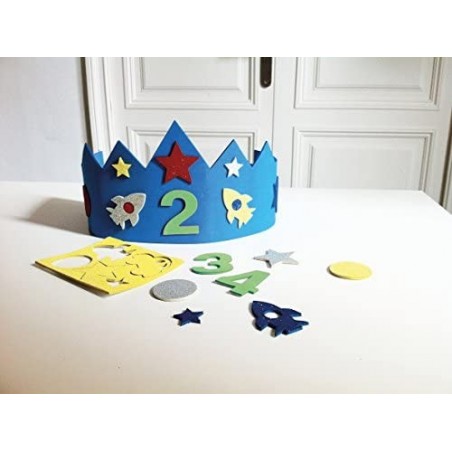 Corona in gomma EVA azzurra con accessori per decorare. La confezione include una corona azzurra, 10 numeri adesivi (0-9) e 24 forme di gomma EVA adesiva con glitter. Regolabile in diverse dimensioni. Ideale come corona di compleanno in modo che il bambino possa personalizzarla a suo piacimento.
